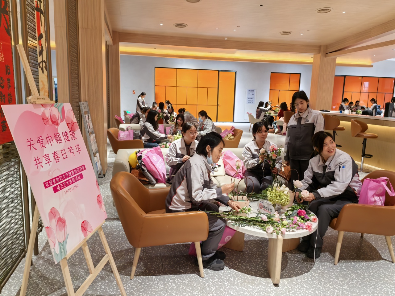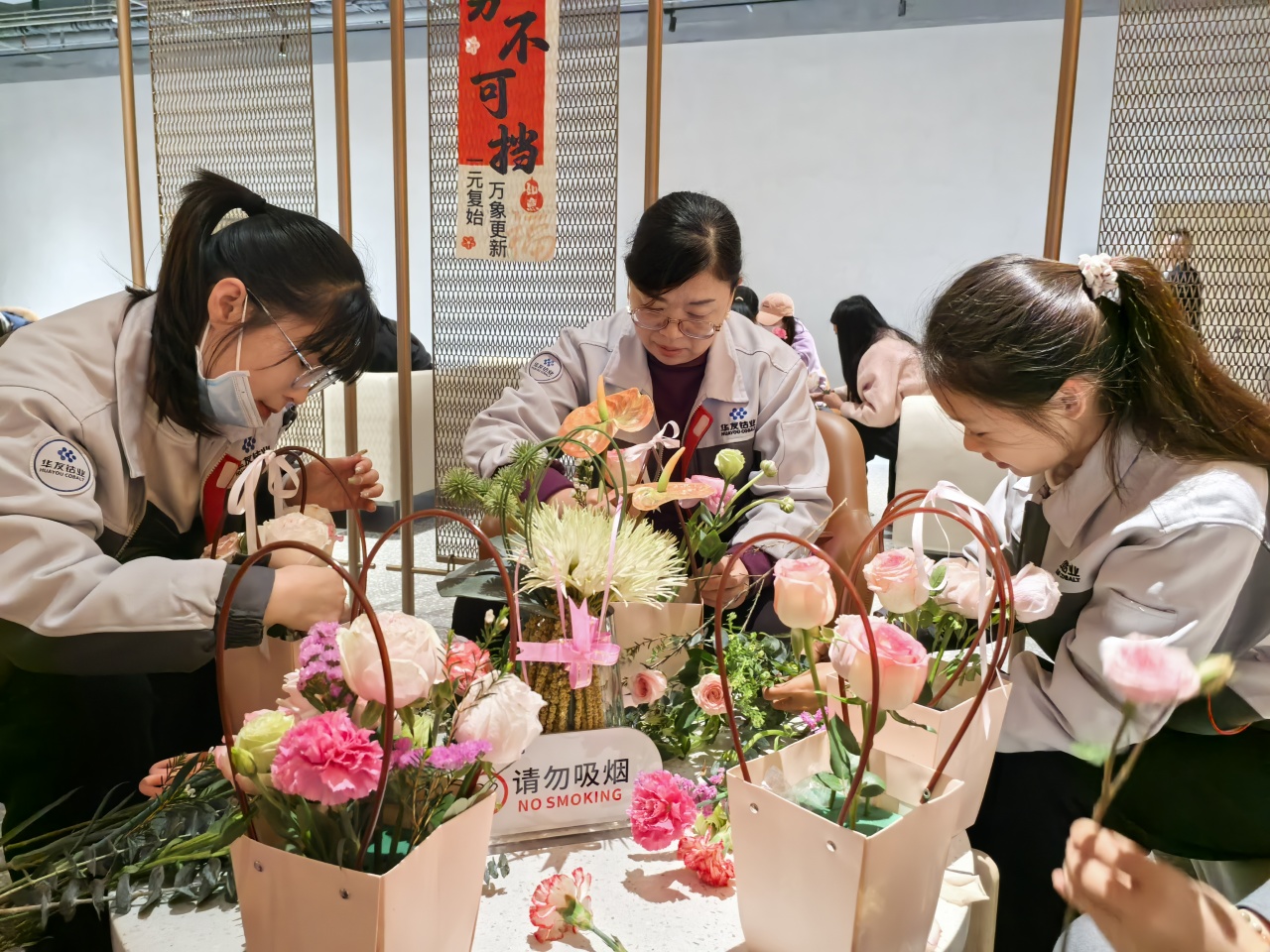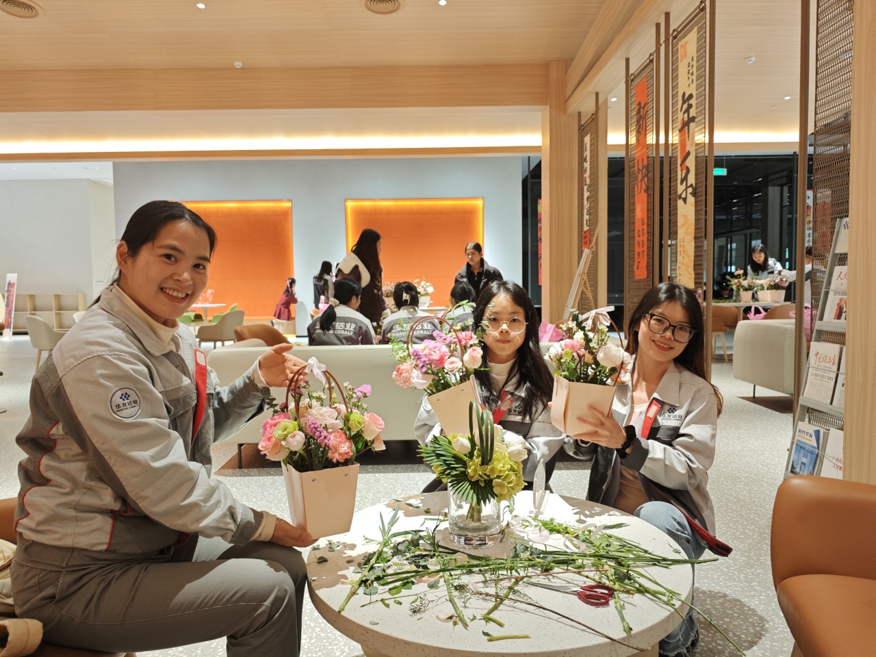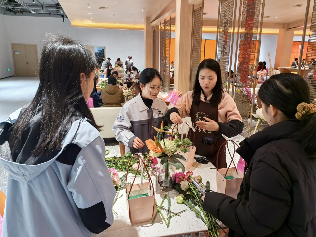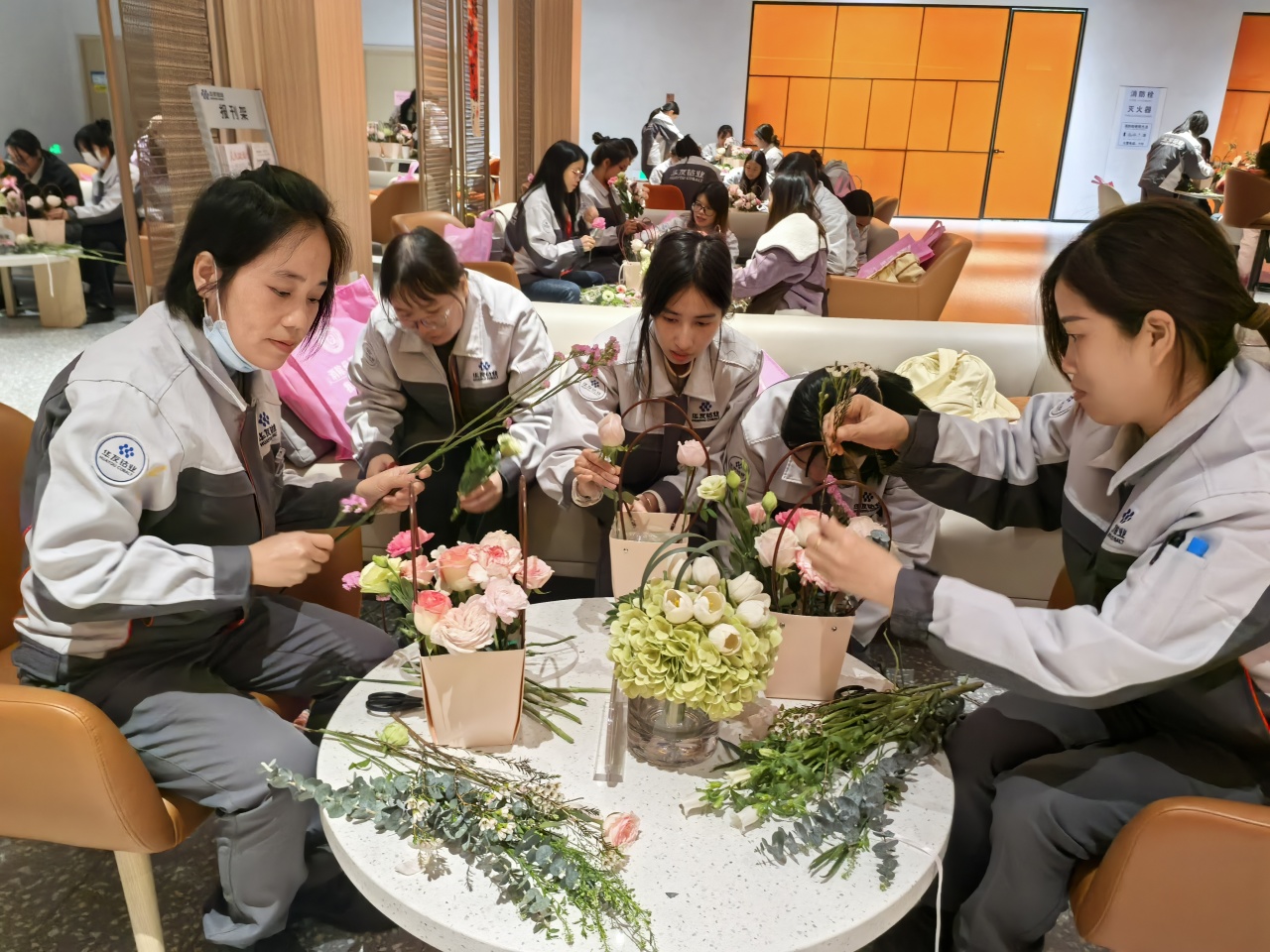健康講座結(jié)束后,員工們在花藝師指導(dǎo)下進行春日主題插花創(chuàng)作。拆開春日花材包的那一刻,商超休閑中心化作花香彌漫的創(chuàng)作空間??的塑暗臏厝帷⒀蠼酃5撵`動、尤加利葉的堅韌…… 每一束花籃都是職場女性多重角色的生動寫照。