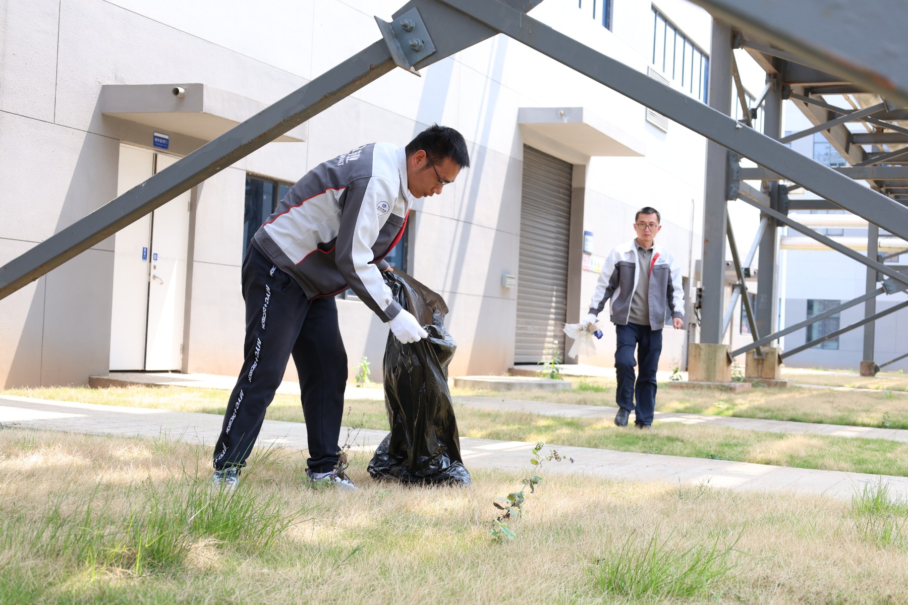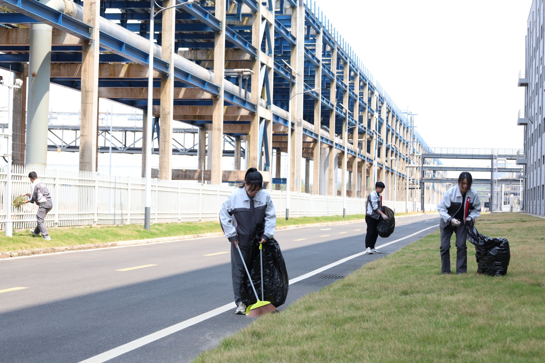 第二組負責清掃道路、草坪等公共區域的垃圾,他們拿著掃帚、垃圾袋等工具,穿梭在廠區的各個角落,無論是隱藏在草叢中的瓶子,還是散落在道路上的紙屑,都逃不過他們的火眼金睛。