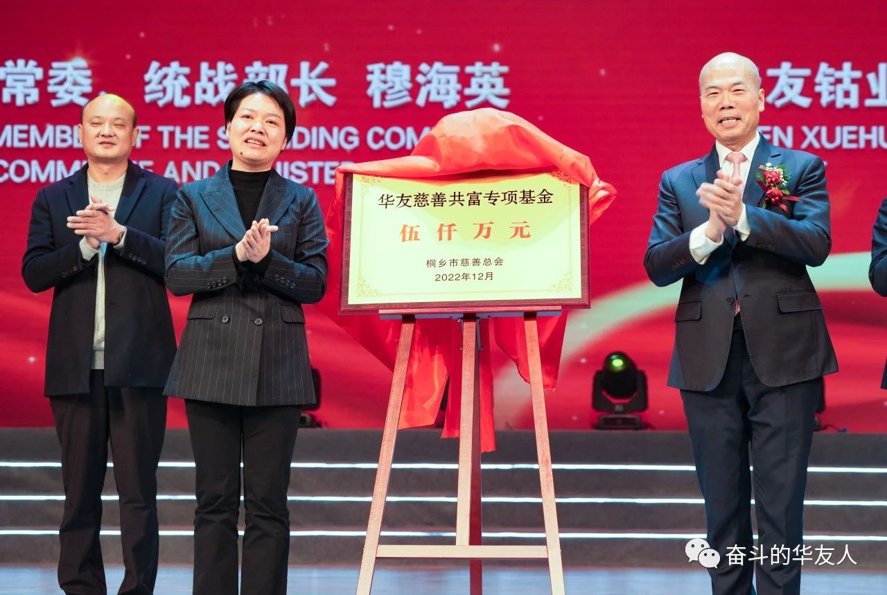 2022年12月19日,在華友鈷業成立二十周年慶祝大會上,華友捐贈5000萬元成立慈善共富基金,主要用于鄉村振興、低收入家庭大病救助、教育事業發展等項目,創下了桐鄉市一次性慈善捐贈最高記錄。