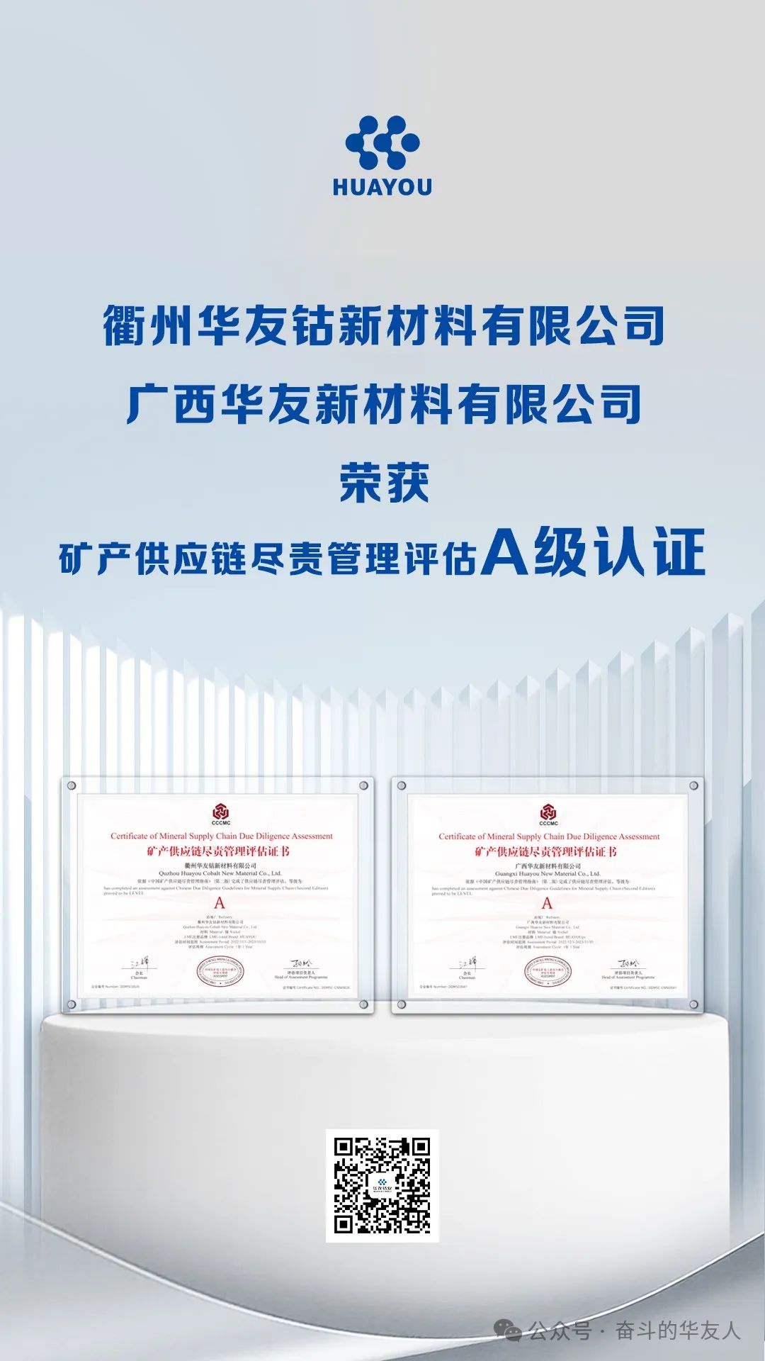 Quzhou Huayou Cobalt New Material Co., Ltd. and Guangxi Huayou New Material Co., Ltd. electro-nickel took the lead in passing the Mineral Supply Chain Due Diligence Management Assessment, and China Chamber of Commerce for Import and Export of Minerals and Chemicals (CCCMC) issued the Mineral Supply Chain Due Diligence Management Assessment Grade A Certificate.