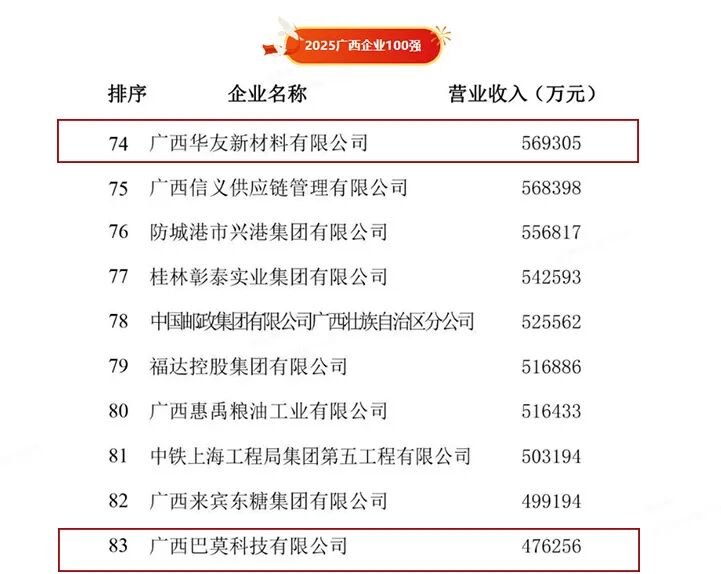 On the list representing the highest honor for comprehensive enterprise strength in Guangxi, the "Top 100 Enterprises in Guangxi," Guangxi Huayou New Materials Co., Ltd. ranked 74th, while Guangxi Bamo Technology Co., Ltd. secured the 83rd position. The joint entry of these two companies into the top 100 enterprises in the region marks that Huayou Guangxi Park now possesses significant comprehensive competitiveness.
