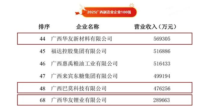 Recently, the lists of the Top 100 Enterprises in Guangxi and the Top 100 Manufacturing Enterprises in Guangxi for 2025 were officially released. Multiple subsidiaries of Huayou Guangxi Park have made strong appearances on these lists, showcasing the park's robust manufacturing capabilities and outstanding development achievements in a clustered manner, and presenting a brilliant report card for the fifth anniversary of Huayou Guangxi Park's construction.