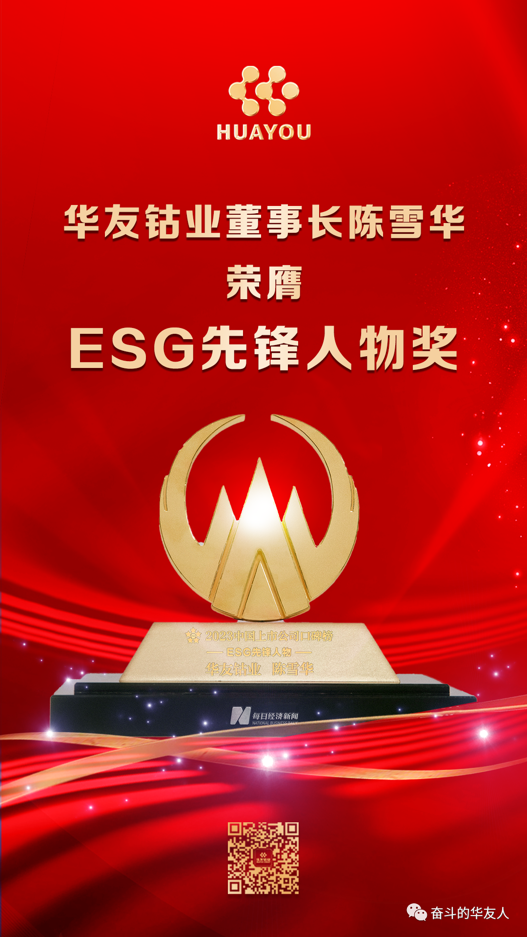 近日,由每日經濟新聞舉辦的“2023第十三屆中國上市公司口碑榜”頒獎典禮在四川瀘州舉行,集團董事長陳雪華獲評“ESG先鋒人物獎”。