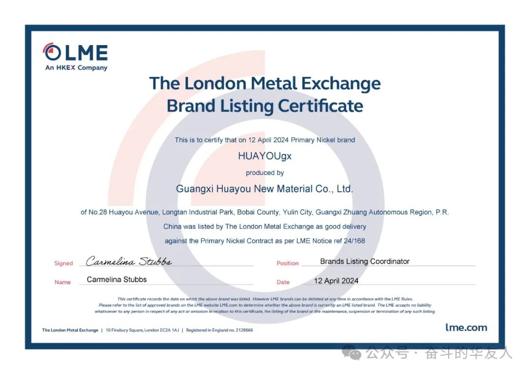 又一標(biāo)志性成果!“HUAYOUgx”牌電解鎳在LME注冊成功