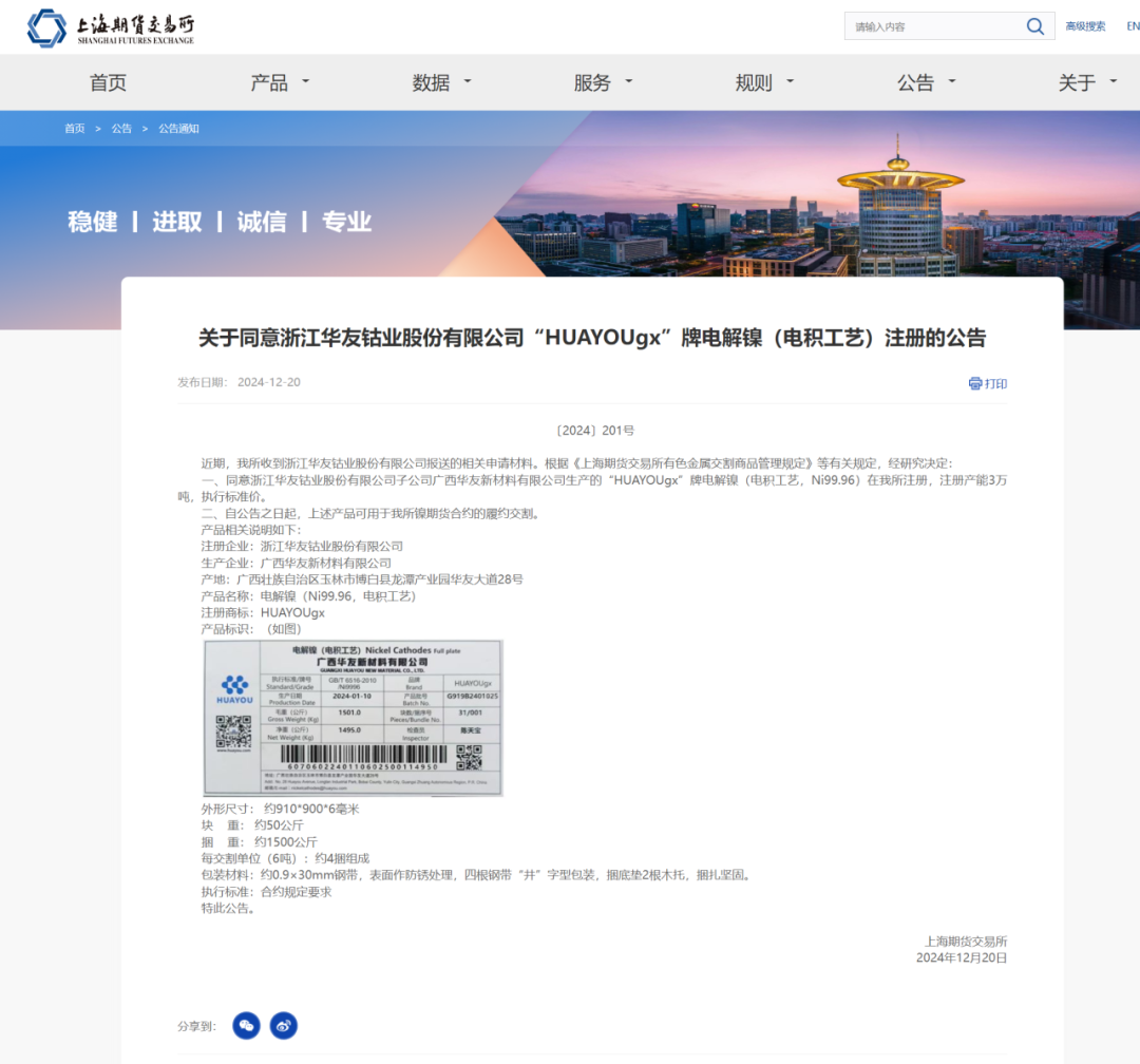 12月20日,華友鈷業(yè)子公司廣西華友新材料有限公司生產(chǎn)的“HUAYOUgx”牌電解鎳(電積工藝,Ni99.96)成功在上海期貨交易所(以下簡稱“上期所”)注冊(cè),注冊(cè)產(chǎn)能為3萬噸。