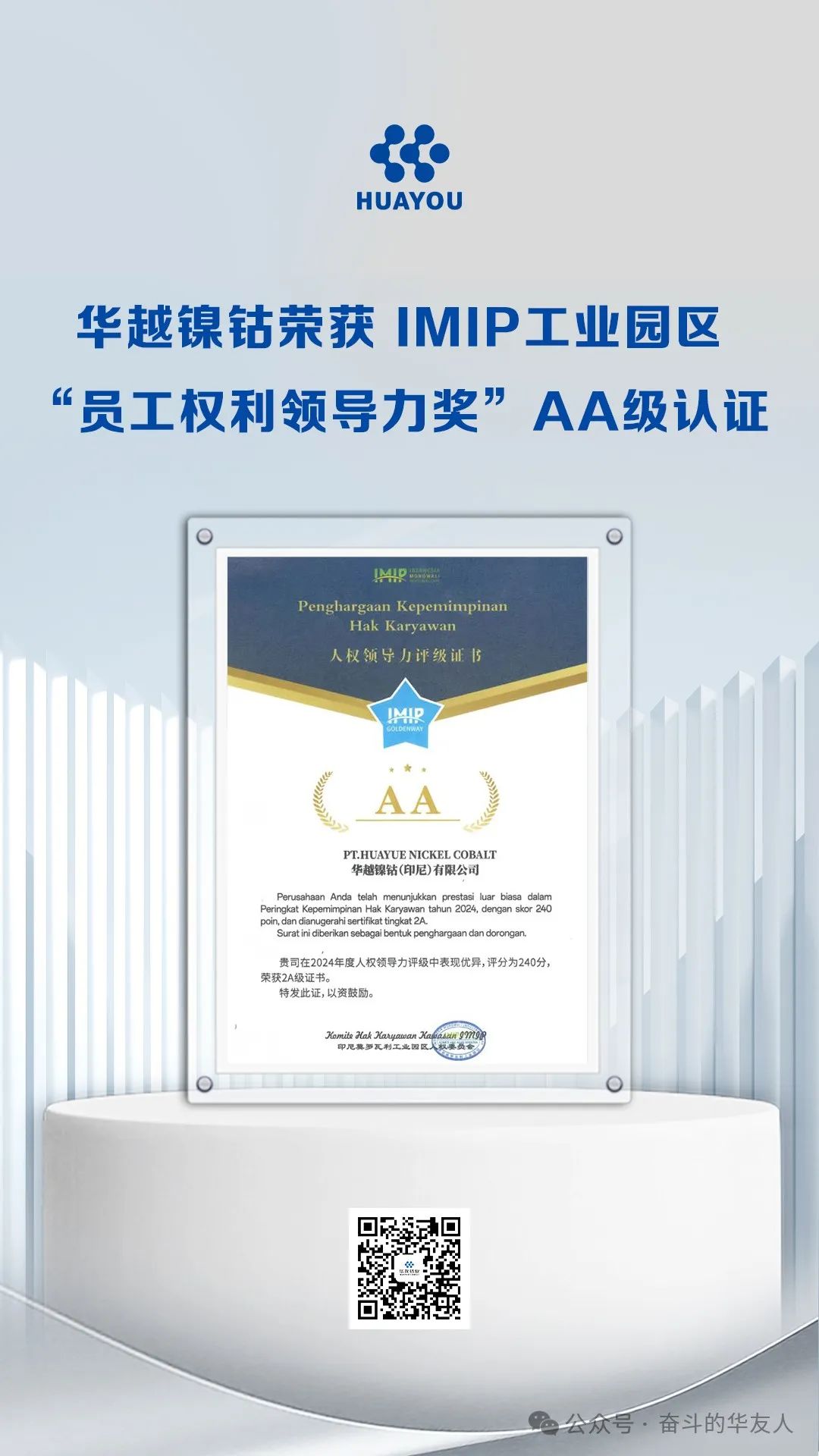 近日,華越鎳鈷(印尼)有限公司憑借卓越的員工管理體系與人權保障實踐,在2024 年度 IMIP 印尼莫羅瓦利工業園區人權委員會組織的員工權利領導力評級評選中脫穎而出,榮獲 AA 級認證,并取得 240 分的優異成績,充分彰顯了公司在人力資源管理及員工權益保障領域的領先地位。