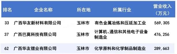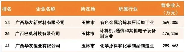 廣西制造業民營企業100強榜單中,廣西華友新材料有限公司位列第24名,廣西巴莫科技有限公司排名第26位,廣西華友鋰業有限公司位居第41名。