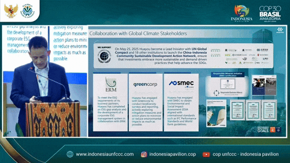 11月10日至21日,《聯合國氣候變化框架公約》第三十次締約方大會(COP30)在巴西貝倫(Belém)舉行。全球約193個國家/締約方,逾56000人次參與了本次活動。華友作為印尼鎳下游產業化轉型的“核心推動者”之一、綠色減碳優秀企業代表,受印尼環境部邀請參加本次活動,響應大會主題。