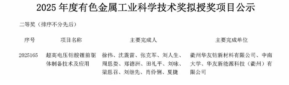 近日,2025年度中國有色金屬工業科學技術獎獲獎名單揭曉,華友鈷業憑借兩大核心產品的技術突破與產業化深耕,斬獲兩大獎項。其中,華友鈷業與北京當升材料科技股份有限公司聯合攻關的“長續航車用高性能高鎳復合正極材料的開發與產業化”項目,榮登一等獎榜單;由衢州華友鈷新材料有限公司牽頭,華友新能源科技 (衢州) 有限公司深度參與的“超高電壓鈷酸鋰前驅體制備技術及應用”項目,斬獲二等獎。