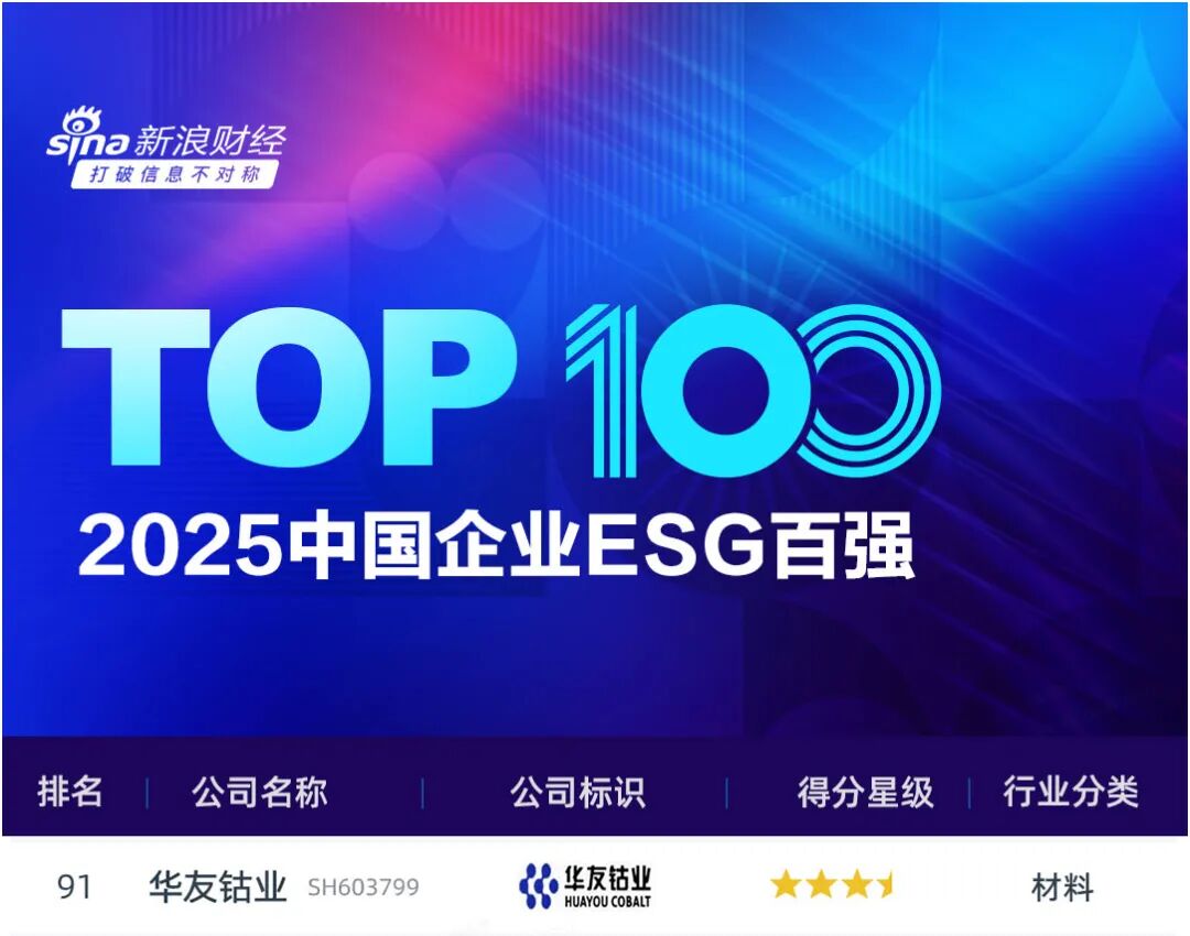 近日,新浪財(cái)經(jīng)發(fā)布“2025中國企業(yè)ESG百強(qiáng)”榜單,華友鈷業(yè)憑借在環(huán)境(E)、社會(huì)(S)、公司治理(G)的出色表現(xiàn),成功從5000余家A股上市公司及在港上市內(nèi)地企業(yè)中脫穎而出,入選該榜單,位列第91位。此次入選不僅彰顯了權(quán)威機(jī)構(gòu)對(duì)華友鈷業(yè)可持續(xù)發(fā)展實(shí)踐的高度認(rèn)可,更確立了華友作為新能源行業(yè)ESG標(biāo)桿企業(yè)的領(lǐng)先地位。
